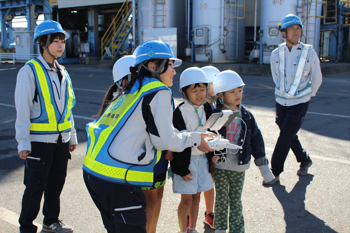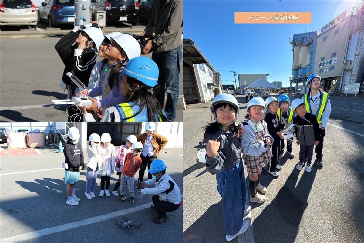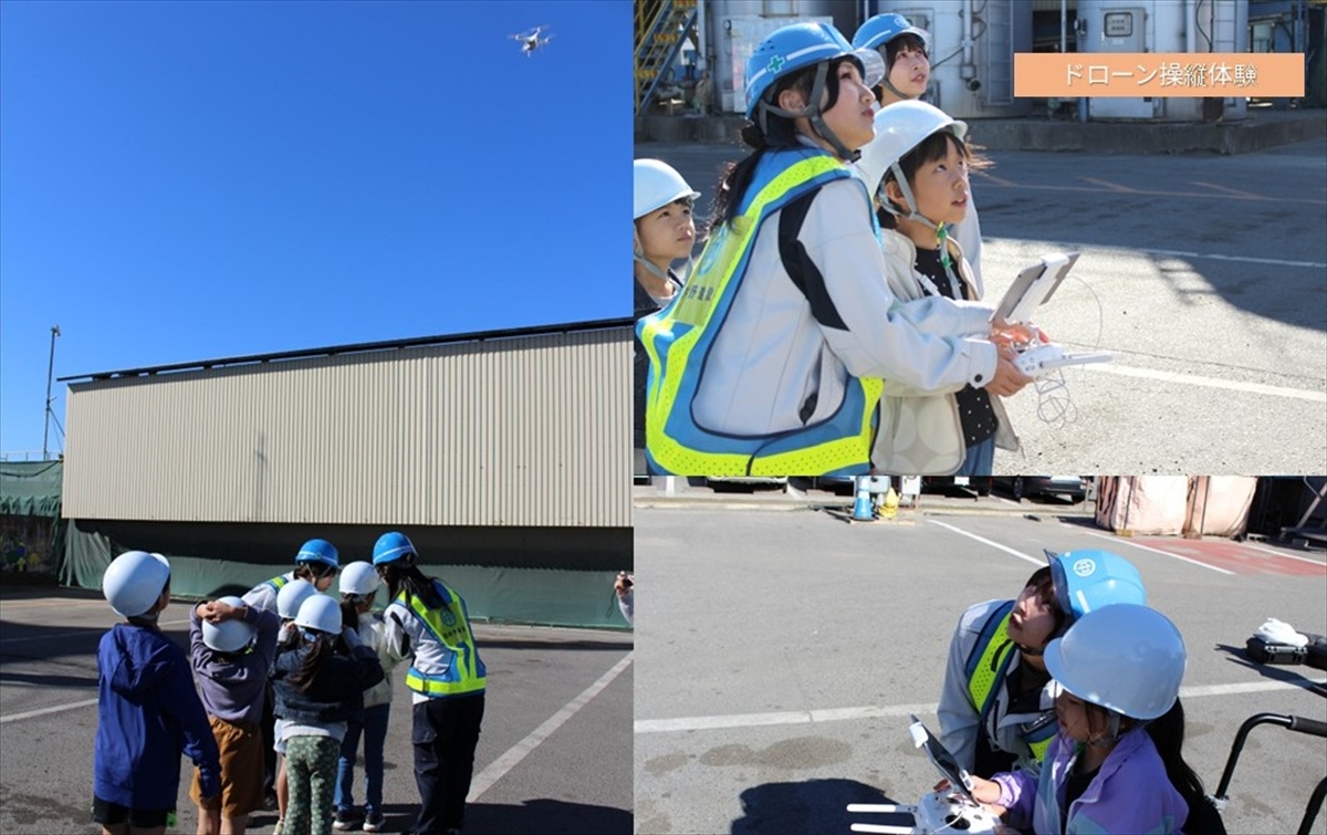 ドローン体験では、現場での活用方法について説明を受けながら担当者と一緒に操作を行い、ゲームとは違う“操縦の難しさ”を実感。ドローンが大きく上昇すると、モニターに映る景色に「わぁ!」と歓声が上がりました。