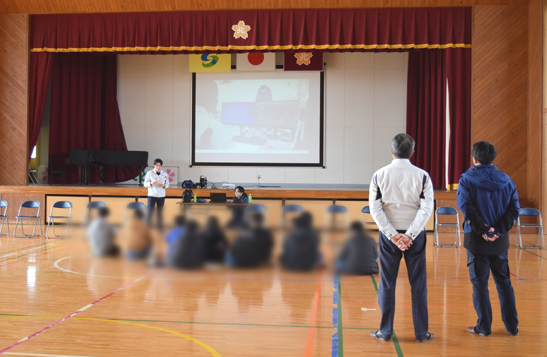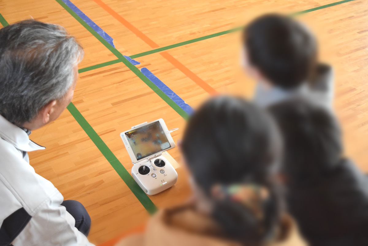また当日は、ドローンの模擬飛行も実施しました。 大きな音を立てて頭上高く舞い上がるドローンに、子どもたちは興味津々。実際に操作を体験してもらい、測量時のように空から撮影を行うと、体育館は歓声に包まれ、大いに盛り上がりました。
