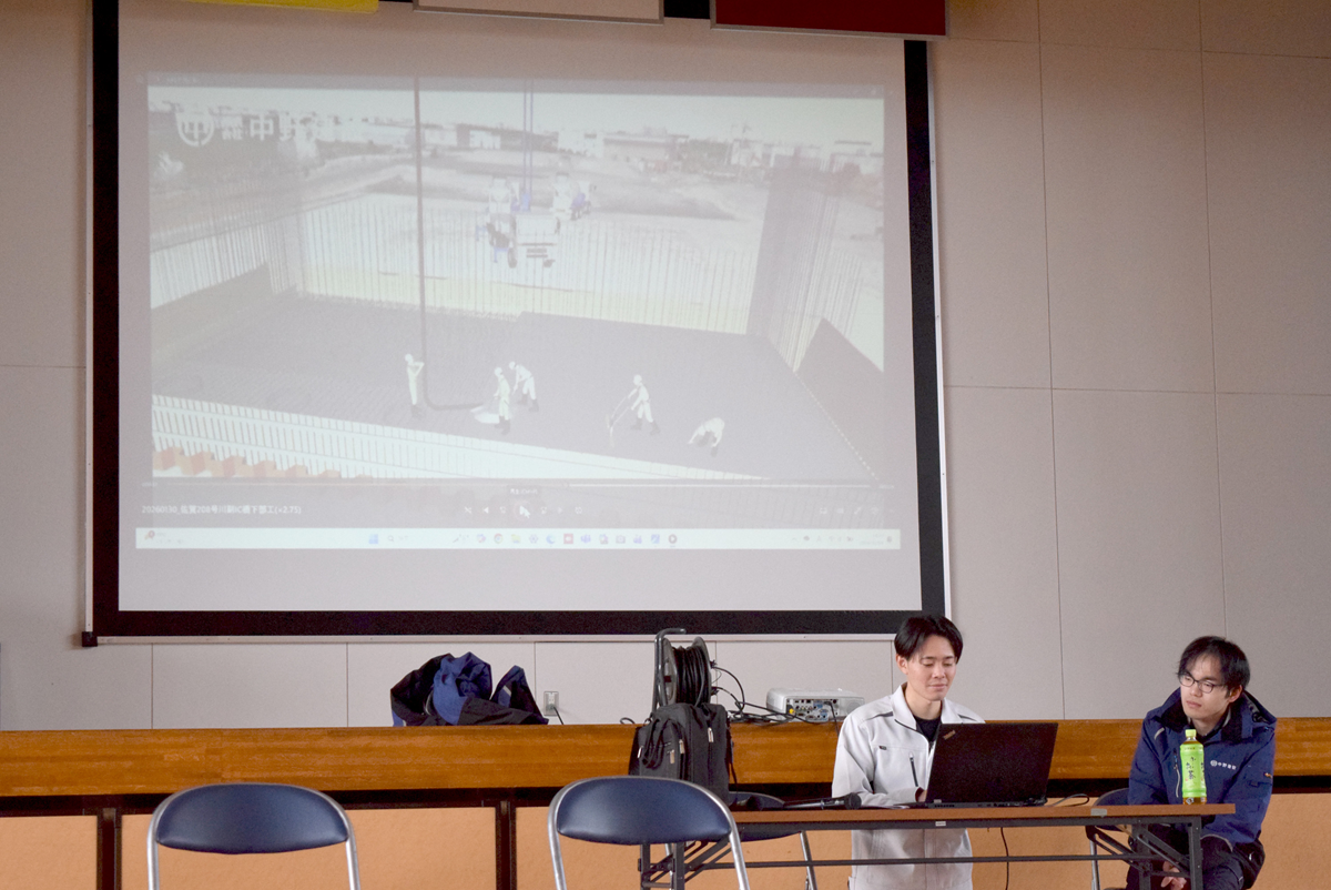 北川副小学校の皆さんはとても積極的で、ICTの話題にとどまらず、建設業の役割や専門的な言葉についても多くの質問が飛び交いました。小学生ならではの率直な質問は、話す側にとっても良いアウトプットの機会となり、少しでもイメージしやすく伝えられるよう、身振り手振りを交えながら説明するなどの工夫を行いました。