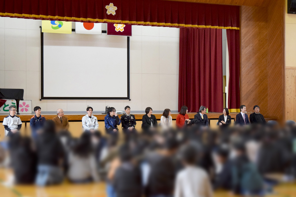 本授業は、さまざまな職業に携わる大人の話を聞き、実演や経験談を通じて「働くこと」への理解を深め、将来の夢や目標について考えることを目的に行われたものです。当日は、消防士や町長、アナウンサーなど、10数名の講師が参加し、それぞれの仕事のやりがいや想いを子どもたちに伝えていました。
