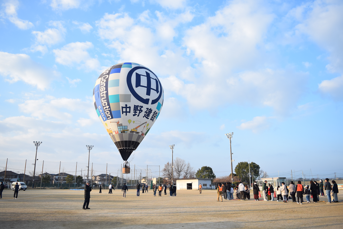 日の出前から嘉瀬まちづくり協議会や消防団など地域の皆さまが集い、トラクターで明かりを灯したり受付を行ったり、準備が着々と進められました。また、本イベントは、毎年「中野建設バルーンチーム」を中心に行っています。辻パイロットとそのご家族をはじめとする県内の一流クルーの皆さまのもと、指揮が取られ、今年も無事に子どもたちの喜ぶ顔を見ることができました!