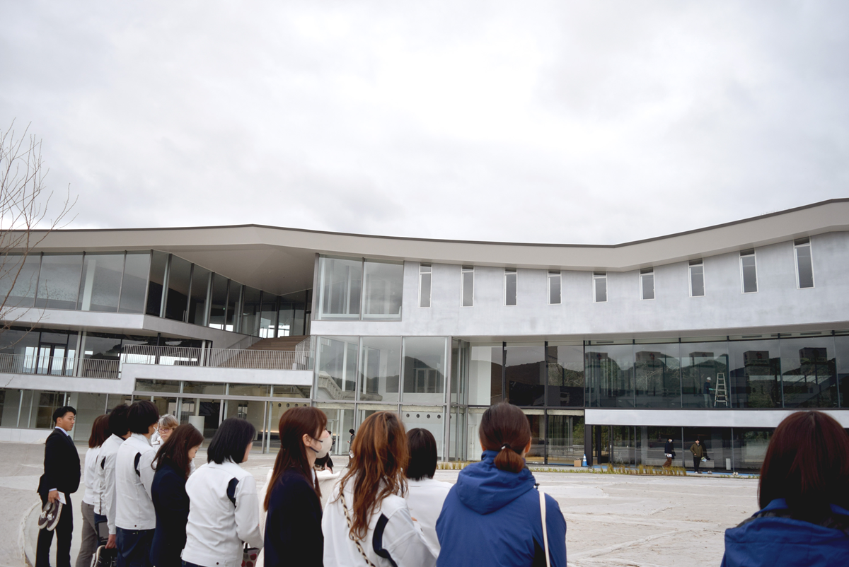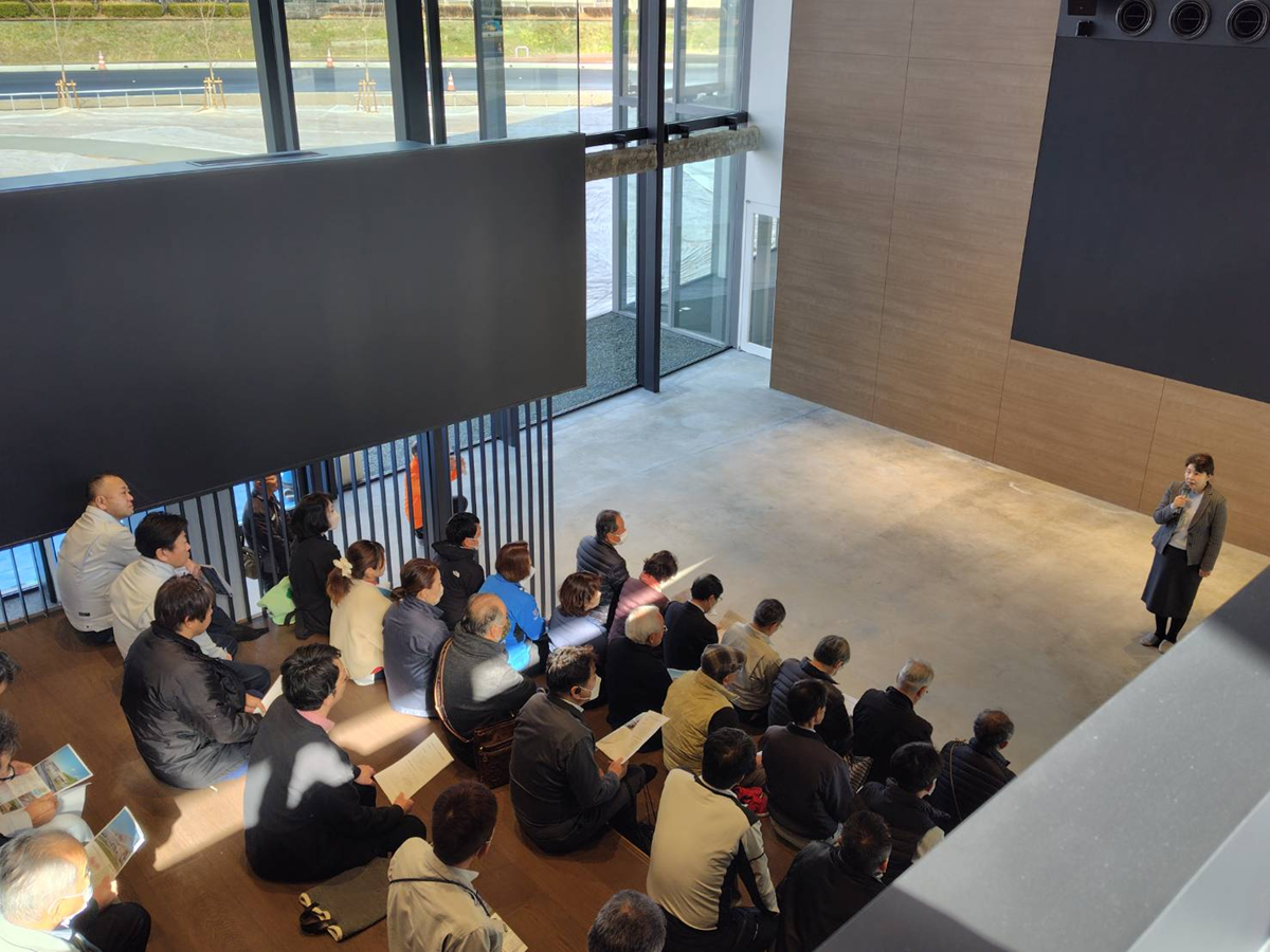 当日は、設計監理を担当された株式会社宗本晋作建築士設計事務所の宗本代表より、耐震性への工夫やその土地の文脈を読みとり地域との調和を意識した設計の考え方、学生や地域の方々が自然と集える空間づくりについて直接ご説明いただきました。
