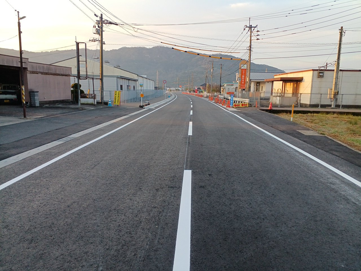 本工事は、多久江北線(別府工区)における舗装工事として、佐賀中央病院の開院に伴う幅員狭小による通行支障の改善および歩道整備を行い、利用者が安全・安心に通行できる道路環境の整備を目的としたものである。施工にあたっては、開院前に東多久駅から病院へ通じる東側歩道を優先的に完成させ、安全確保に努めた。 また、民家・工場・病院が近接する中での施工であったため、事前の連絡調整や夜間作業の実施により出入口の確保とトラブル防止を図った。限られた作業スペースにおいては施工エリアを区分し、既設水道管にも配慮しながら効率的に施工を進めた。さらに、既設舗装との高低差についてはすりつけ舗装により段差を解消し、安全な交通開放を実現した。交通規制時間内での施工を徹底するため工程管理を行い、渋滞の発生を抑制しながら、円滑かつ良好な施工を達成した。